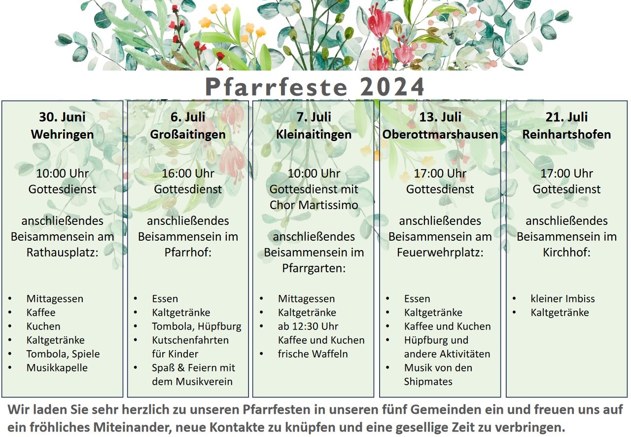 Aktuelles Sommerzeit ist Pfarrfestzeit Auch 2024 veranstalten die Pfarreien der Pfarreiengemeinschaft wieder ihr jährliches Pfarrfest.