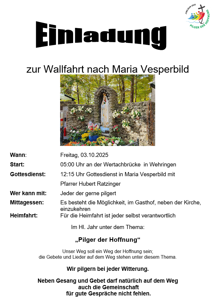 Aktuelles Wallfahrt Maria Vesperbild Die Pfarreiengemeinschaft Großaitingen lädt ein zur Wallfahrt nach Maria Vesperbild am 3.10.2025.